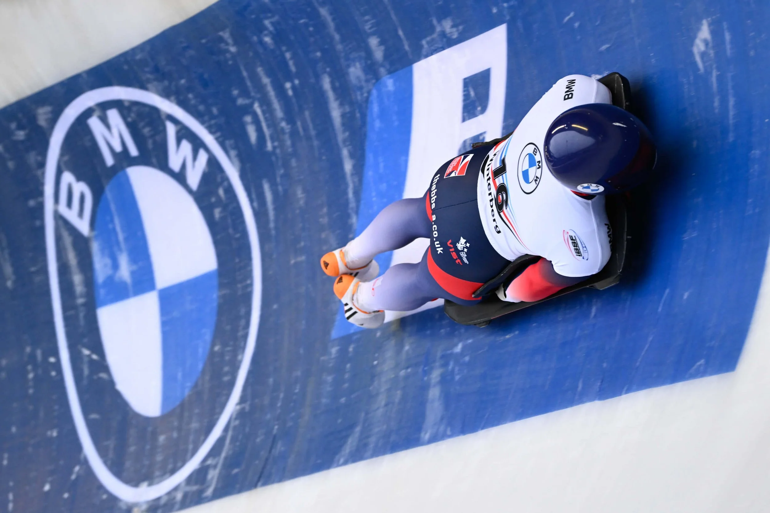 Skeleton athletes wear specialist racing helmets. The design of the helmet is very important because it must be strong enough to protect the athlete’s skull during impact, but also light enough so that it doesn’t feel heavy when they hit corners at 5G speeds. The helmet covers the face and the chin because the athlete’s head will often touch the ice.